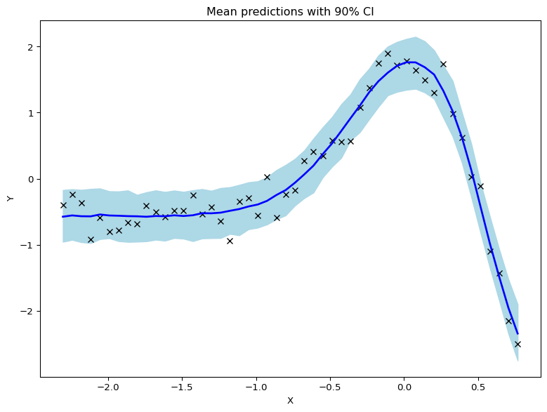 Text(0.5, 1.0, 'Mean predictions with 90% CI')]